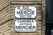 Le nom de la rue Antonin-Mercié rend, depuis 1920, hommage à Antonin Mercié, sculpteur et peintre né à Toulouse le [1] et mort à Paris le . Élève d'un autre Toulousain, Alexandre Falguière, et de François Jouffroy à l'École des beaux-arts de Paris, il remporte le prix de Rome en sculpture de 1868. Avec Jean-Marie Mengue, Laurent Marqueste, Victor Ségoffin et Auguste Seysses, il fait partie du « groupe des Toulousains ». Quoiqu'il passe l'essentiel de sa carrière à Paris, la municipalité toulousaine lui confie, avec son maître Falguière, le Monument à Goudouli qui orne le bassin du square de la place Lafayette (actuelle place Wilson) à Toulouse.