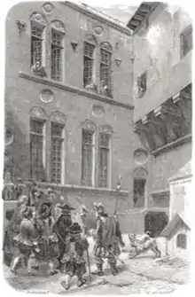 Pierre Bucher dessina les plans du premier édifice et il sculpta lui-même certains éléments. Bâtiment représentatif de l'architecture Renaissance, construit entre 1565 et 1570 sur les vestiges de l'enceinte gallo-romaine[7].