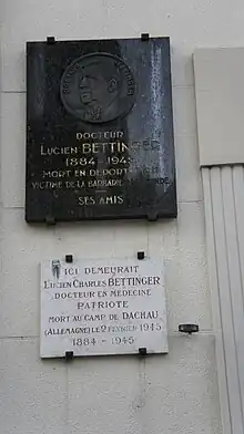 - Au n°31, plaque mémorielle en l'honneur du Docteur Lucien Charles Bettinger mort en déportation le 2 février 1945 au camp de Dachau.