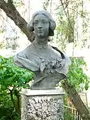 À gauche, la colonne supportant le buste de Clotilde de Vaux par Décio Villarès, et à droite, une vue détaillée de la sculpture. | ||
