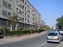 Du côté gauche, un ensemble d'immeubles construits en 1960[1] puis le petit parking de la place de l'église[3].