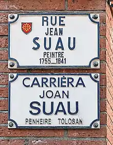 Le nom de la rue rend hommage à Jean Suau (1755-1841), peintre toulousain qui vécut et mourut dans un immeuble, aujourd'hui disparu, rue de la Capelle-Redonde (emplacement au-devant de l'actuel no 2). Jean Suau, fils d'Antoine Suau et de Marie Trulhet, fit d'abord des études de droit, mais les abandonna pour se consacrer à la peinture et fut en particulier l'élève de Jean-Pierre Rivalz. Le , il remporta le grand prix de peinture de l'Académie royale de peinture, sculpture et architecture de la ville, et le il en était nommé professeur. Il reconstitua après la Révolution française l’École des Arts, et y fut l'un des maîtres de Dominique Ingres entre 1791 et 1796[1]. Il dirigea les classes de l'antique, du modèle vivant et d’anatomie artistique[2]. Il fut nommé chevalier de la Légion d'honneur le [3].