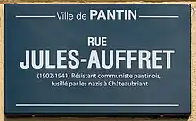 Elle rend hommage à Jules Auffret (1902-1931)[1], fusillé comme otage le 22 octobre 1941 à Châteaubriant[2]. Ouvrier syndicaliste et communiste ; maire adjoint de Bondy et conseiller général de Noisy-le-Sec, il fut arrêté en 1939.