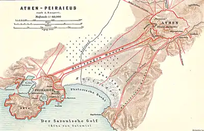 Plan des Longs Murs antiques, reliant Athènes (en haut à droite) au Pirée (en bas à gauche), dont la rue moderne Pireós reprend approximativement le tracé.
