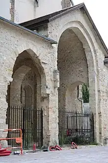 Restes de l'église st-Julien ayant sur la trace de sa nef la statue du baptême de Clovis.