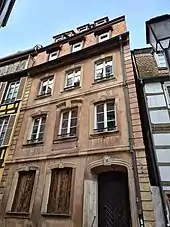 - Formant l'angle avec l'actuelle rue Finkwiller, côté est, une maison est attestée en 1694 lorsque la fondation Saint-Marc la vend à un tonnelier. Sur le plan-relief de 1727, elle ne possède qu'un étage. À la fin du XIXe siècle un deuxième étage et des mansardes sont ajoutés[6].