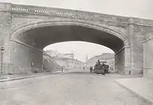 La rue d'Alésia sous le pont ferroviaire, dit Pont-aux-Bœufs, non loin du croisement avec la rue Vercingétorix.