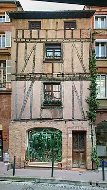 Cette maison, probablement élevée au XVIIe siècle, ne compte qu'une seule travée. Le rez-de-chaussée est maçonné en brique et ouvert par une arcade de boutique et une porte piétonne. Il est surmonté par deux étages et un ancien comble ouvert construits en pan de bois à grille et décharges. Les fenêtres possèdent des encadrements et des appuis en bois mouluré[13].