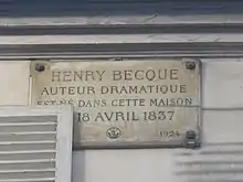 - No 20 : maison natale d'Henry Becque, auteur dramatique (1837-1899). Une plaque commémorative a été apposée sur la façade, en 1924, à l'occasion du 25e anniversaire de sa mort.