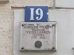 - Les Nos 19-21 : ici s'élevait au XVIIe siècle l'hôtel particulier de Robert Poquelin (v.1630-1715), dit Le Jeune, prêtre et docteur en Sorbonne, curé de l'Église Saint-Sauveur, docteur en théologie de la maison de Navarre, doyen de la Faculté de Paris[2], dont le jardin de son hôtel particulier allait jusqu'à la rue du Gros-Chenet à hauteur du no 4. En 1700, l'abbé Robert Poquelin fait donation de son hôtel à Louis de Lubert (1676-1740), Président à mortier au Parlement de Paris, et amateur de musique [3], qui le divise en appartements qui y verront entre autres: monsieur le marquis de Pezay, le peintre François-Guillaume Ménageot, et le marchand de tableau Lebrun. En 1775, Élizabeth Vigée s’installe avec sa mère, son frère et son beau-père dans l’ hôtel de Lubert[4].. Elle y fait la connaissance de Pierre Lebrun (1748-1813), marchand de tableaux, qui lui fait découvrir sa galerie d’art. Le , elle épouse dans l’intimité Pierre Lebrun. En 1778, le couple Lebrun achète l’ hôtel de Lubert aux héritiers de cette famille. De 1784 à 1785, le couple décide d'agrandir leur hôtel en faisant construire un second bâtiment au fond du jardin par l'architecte Jean-Arnaud Raymond (1739-1811) qui va prendre le nom d' hôtel Lebrun et ouvrira au no 4 de la rue du Gros-Chenet. L'architecte Jean-Arnaud Raymond est également chargé d’agrandir l’ancien hôtel de Lubert et réalise une salle destinée à la vente de tableaux. L’hôtel est relié par un escalier à une salle circulaire couverte d’une coupole lui offrant ainsi un éclairage zénithal. Des gradins surmontés d'arcades en plein cintre eux mêmes surmontés de rideaux entourent cette grande salle, lui donnant un aspect de théâtre antique. Pendant la Révolution, l’Église Notre-Dame-de-Bonne-Nouvelle de Paris étant fermée, la salle Lebrun est réquisitionnée pour la célébration de mariages et de baptêmes. Puis elle sert de salle de concert et disparait finalement au cours du XIXe siècle. Plus aucune trace n’en subsiste aujourd’hui[5] , [6]