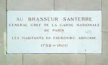 Antoine Joseph Santerre est général chef de la Garde nationale pendant la Révolution. Il sera chargé de conduire le roi Louis XVI à l'échafaud le . Santerre habitait au début de la rue de Reuilly. La plaque est apposée au 9 de cette rue.