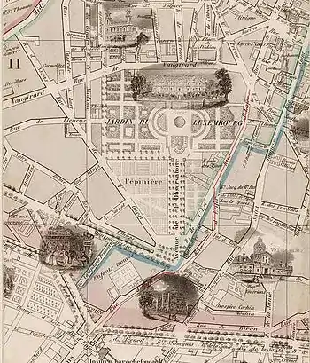 En 1790, l'ordre des Chartreux est supprimé. La chartreuse de Paris est confisquée et vendue comme bien national. Une loi du 27 germinal l'an VI () prévoit le percement de plusieurs voies à l'emplacement de l'enclos des Chartreux : avenue de l'Observatoire, rue de l'Ouest (actuelle rue d'Assas) et rue de l'Est. L'espace entre la rue de l'Est et l'avenue de l'Observatoire n'est pas loti afin d'y établir une pépinière[3].