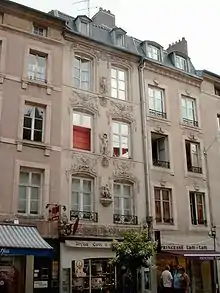 Pâtisserie Lefèvre Georges 2 rue des Dominicains à Nancy en 1980. Ancienne Pâtisserie Schwenninger. - no 4 : ancien magasin Goudchaux[4] : bandeau de la devanture de style Art nouveau faisant l'objet d'une inscription au titre des monuments historiques depuis 1994[5].