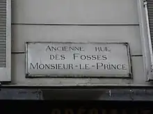 La rue Monsieur-le-Prince a tout d'abord été un chemin qui longeait l'enceinte de Paris. Dans sa partie entre le boulevard Saint-Michel et la rue de Vaugirard, elle a eu successivement les noms suivants : « chemin de Dessus les Fossés » (1419) ; « chemin allant à la Porte Saint-Michel » (1510) ; puis « rue des Fossés Saint-Germain » (1559 à 1582) et enfin « rue des Fossés Monsieur le Prince », devenue « rue de la Liberté » pendant la période révolutionnaire, de 1793 à 1805[1]. Une autre rue des Fossés-Saint-Germain était située rive droite, en référence à l'église Saint-Germain-l'Auxerrois : elle devint rue Perrault.