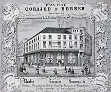 - Au milieu du XIXe siècle, la maison abrite le magasin de nouveautés Corajod et Borrer. Le lithographe Jean Lemaître, qui habitait dans l'immeuble, réalise une vignette publicitaire pour ce commerce[37].