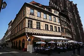 - À l'angle du no 15 de la place de la Cathédrale, cette grande maison bourgeoise médiévale, à deux étages en encorbellement, mitoyenne de la maison Kammerzell qui se trouve au no 16 de ladite place, a été souvent transformée. Plusieurs inscriptions et dates gravées permettent d'en penser la chronologie et d'apprécier l'importance de cet édifice dont le décor Renaissance est la première manifestation de ce style à Strasbourg, selon la date de 1528 portée sur la console d'angle. C'est peut-être le cas également des motifs des pans de bois des allèges (restaurés en 1895), devenus fréquents à partir de la seconde moitié du XVIe siècle. On remarque en outre un monumental corbeau gothique, situé à proximité du no 24[17],[7]. Les éléments du Moyen Âge et de la Renaissance (tourelle d'escalier à vis, plafond stuqué, chambranles de portes, fenêtres et niches, peintures murales) font l'objet d'une inscription au titre des monuments historiques depuis 1988[36].