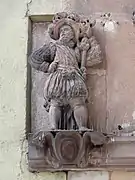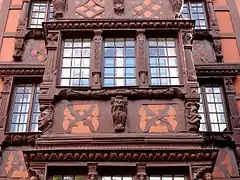 - Doté de pans de bois au riche décor antiquisant (statues de femmes, colonnettes et pilastres, frises d'oves et consoles à volutes[18]), cet oriel s'inspire directement de la maison Kammerzell, toute proche, et dont la façade venait de prendre son aspect définitif en 1589[19]. L'immeuble actuel date de 1951-1953[20].