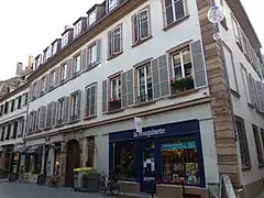 - Connue sous le nom d'« hôtel de Saxe, » la maison appartenait au XVIIe siècle au stettmestre Henri Balthasar de Kippenheim, puis à différentes familles nobles. Elle est vendue en 1779 à Christine de Saxe, abbesse de Remiremont, dont on a longtemps pensé qu'elle en était la commanditaire. Depuis la fin de la Première Guerre mondiale, la demeure appartient à une fondation diocésaine[12]. Surmontée d'un fronton triangulaire percé d'un oculus, la façade de style Régence, entièrement parementée de grès, comporte trois niveaux et neuf travées de baies. Elle est ornée de mascarons figurant les quatre saisons[5],[13]. Cette façade fait l'objet d'un classement au titre des monuments historiques depuis 1927[14].