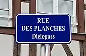 La « rue des Planches » est ainsi attestée en 1792, 1920 et depuis 1945. Lors de l'occupation allemande, elle avait repris le nom Dielengasse, en 1872 et 1940[1].