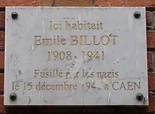 - Daniel Grason, « Billot Émile, Jean-Baptiste », maitron-fusilles-40-44.univ-paris1.fr (consulté le 18 septembre 2018).