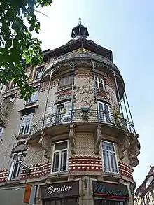 - Formant l'angle avec le no 24 de la rue Brûlée, cet immeuble de rapport est nommé Volkskunst (« art du peuple ») pour signifier que l'art nouveau n'est pas réservé aux quartiers résidentiels. Construit pour l'entrepreneur Albert Wieger par les architectes Jules Berninger et Gustave Krafft, il se distingue par une façade en briques jaunes et rouges, une tourelle d'angle avec toiture en pointe, deux balcons circulaires avec garde-corps en ferronnerie[8],[9].