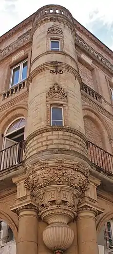 L'immeuble se situe à l'angle de la rue Baronie, où se situe l'entrée principale. Il est orné d'un décor de style néo-Renaissance en céramique, caractéristique du milieu du XIXe siècle, provenant de la fabrique Virebent, qui se concentre sur la tourelle et la travée centrale. Du rez-de-chaussée, construit en pierre, partent des colonnes engagées en pierre, séparant les arcades qui embrassent les boutiques et l'entresol. Le reste des élévations est construit en brique claire.