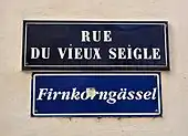 Des plaques de rues bilingues, à la fois en français et en alsacien, ont été mises en place par la municipalité à partir de 1995[6]. C'est le cas du Firnkorngässel.