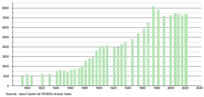 - Population municipale légale en vigueur au 1er janvier 2024, millésimée 2021, définie dans les limites territoriales en vigueur au 1er janvier 2023, date de référence statistique : 1er janvier 2021.