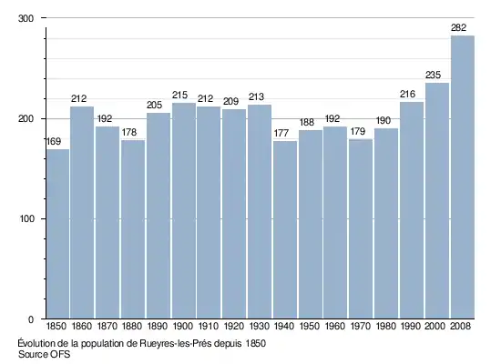 Le graphique suivant résume l'évolution de la population de Rueyres-les-Prés entre 1850 et 2008[3] :