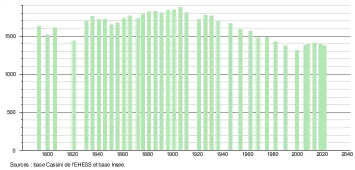 L'évolution du nombre d'habitants est connue à travers les recensements de la population effectués dans la commune depuis 1793. Pour les communes de moins de 10 000 habitants, une enquête de recensement portant sur toute la population est réalisée tous les cinq ans, les populations légales des années intermédiaires étant quant à elles estimées par interpolation ou extrapolation[21]. Pour la commune, le premier recensement exhaustif entrant dans le cadre du nouveau dispositif a été réalisé en 2008[22].