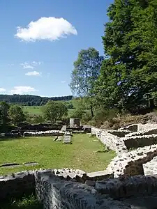 Les vestiges situés près du ruisseau sont ceux d'une somptueuse villa dotée de l'eau courante et de chauffage et décorée de mosaïques et d'enduits peints. La partie de la villa située au sud-est est plus récente que la partie située au nord-ouest. À la fin du IIe siècle ou au début du IIIe siècle, sans doute à la suite d'un incendie, le bâtiment a été reconstruit et agrandi.