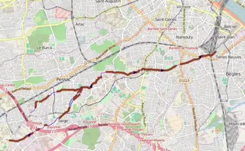 De 10 km de longueur, il passe[2] d'ouest en est sous les communes de Pessac, Talence, Bègles et Bordeaux.