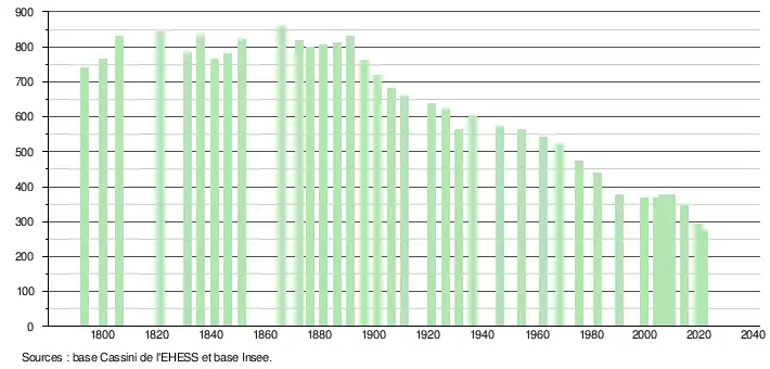 L'évolution du nombre d'habitants est connue à travers les recensements de la population effectués dans la commune depuis 1793. Pour les communes de moins de 10 000 habitants, une enquête de recensement portant sur toute la population est réalisée tous les cinq ans, les populations légales des années intermédiaires étant quant à elles estimées par interpolation ou extrapolation[34]. Pour la commune, le premier recensement exhaustif entrant dans le cadre du nouveau dispositif a été réalisé en 2004[35].
