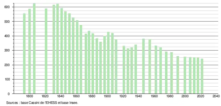 L'évolution du nombre d'habitants est connue à travers les recensements de la population effectués dans la commune depuis 1793. Pour les communes de moins de 10 000 habitants, une enquête de recensement portant sur toute la population est réalisée tous les cinq ans, les populations légales des années intermédiaires étant quant à elles estimées par interpolation ou extrapolation[28]. Pour la commune, le premier recensement exhaustif entrant dans le cadre du nouveau dispositif a été réalisé en 2006[29].
