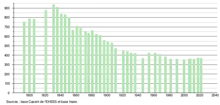 L'évolution du nombre d'habitants est connue à travers les recensements de la population effectués dans la commune depuis 1793. Pour les communes de moins de 10 000 habitants, une enquête de recensement portant sur toute la population est réalisée tous les cinq ans, les populations légales des années intermédiaires étant quant à elles estimées par interpolation ou extrapolation[21]. Pour la commune, le premier recensement exhaustif entrant dans le cadre du nouveau dispositif a été réalisé en 2007[22].