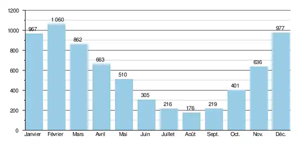 Le débit instantané maximal enregistré a été de 18,60 m3/s le , tandis que le débit journalier maximal se montait à 14,70 m3/s le même jour, ainsi que la hauteur maximale instantanée à 192 cm soit 1,92 m.