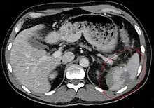 Un scanner de l'abdomen peut donner un aperçu plus complet des blessures spléniques et autres, pouvant montrer une fracture, des lacérations ou un hématome sous-capsulaire. La gravité des lésions peut être ainsi classée[9] ce qui permet une optimisation de la prise en charge et une diminution sensible de la nécessité d'une prise en charge chirurgicale[10].