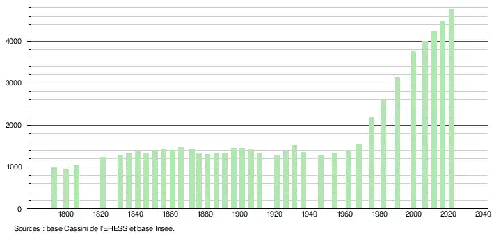 L'évolution du nombre d'habitants est connue à travers les recensements de la population effectués dans la commune depuis 1793. Pour les communes de moins de 10 000 habitants, une enquête de recensement portant sur toute la population est réalisée tous les cinq ans, les populations légales des années intermédiaires étant quant à elles estimées par interpolation ou extrapolation[31]. Pour la commune, le premier recensement exhaustif entrant dans le cadre du nouveau dispositif a été réalisé en 2006[32].