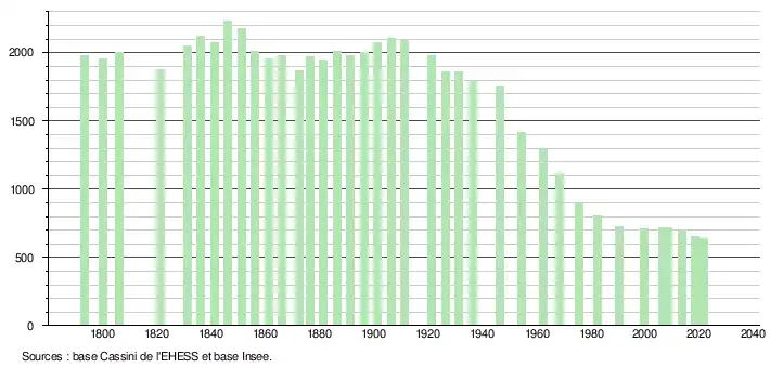 L'évolution du nombre d'habitants est connue à travers les recensements de la population effectués dans la commune depuis 1793. Pour les communes de moins de 10 000 habitants, une enquête de recensement portant sur toute la population est réalisée tous les cinq ans, les populations légales des années intermédiaires étant quant à elles estimées par interpolation ou extrapolation[32]. Pour la commune, le premier recensement exhaustif entrant dans le cadre du nouveau dispositif a été réalisé en 2008[33].