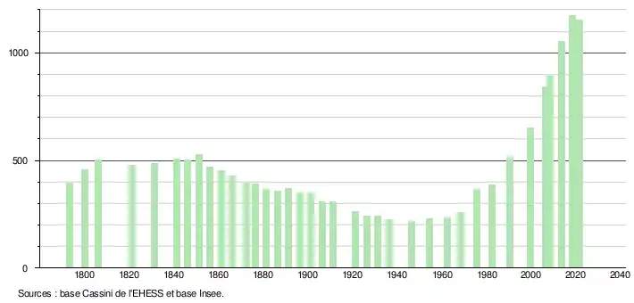 L'évolution du nombre d'habitants est connue à travers les recensements de la population effectués dans la commune depuis 1793. Pour les communes de moins de 10 000 habitants, une enquête de recensement portant sur toute la population est réalisée tous les cinq ans, les populations légales des années intermédiaires étant quant à elles estimées par interpolation ou extrapolation[25]. Pour la commune, le premier recensement exhaustif entrant dans le cadre du nouveau dispositif a été réalisé en 2008[26].