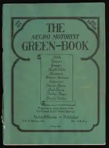Une édition du Negro Motorist Green Book (dit Green Book) est publiée chaque année entre 1936 et 1966 par Victor Hugo Green. C'est un guide de voyage qui donnait annuellement la liste des hôtels, campings, restaurants, bars, dancings, garages, stations d'essence, etc., où les Noirs étaient les bienvenus au milieu des terres ségrégationnistes. Limitée à l'origine à la métropole new-yorkaise, l'édition remporte un grand succès et couvre ensuite presque tous les États-Unis, partie du Canada, du Mexique et des Caraïbes, et devient « la bible du voyageur noir durant les lois Jim Crow »[27]. Des guides de ce type existaient déjà à l'époque pour le public juif des États-Unis, lui aussi victime de discriminations[28].