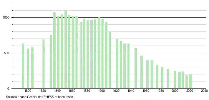 L'évolution du nombre d'habitants est connue à travers les recensements de la population effectués dans la commune depuis 1793. Pour les communes de moins de 10 000 habitants, une enquête de recensement portant sur toute la population est réalisée tous les cinq ans, les populations légales des années intermédiaires étant quant à elles estimées par interpolation ou extrapolation[26]. Pour la commune, le premier recensement exhaustif entrant dans le cadre du nouveau dispositif a été réalisé en 2005[27].