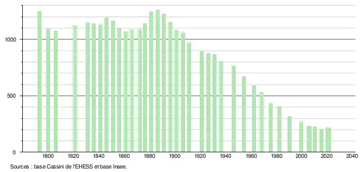 L'évolution du nombre d'habitants est connue à travers les recensements de la population effectués dans la commune depuis 1793. Pour les communes de moins de 10 000 habitants, une enquête de recensement portant sur toute la population est réalisée tous les cinq ans, les populations légales des années intermédiaires étant quant à elles estimées par interpolation ou extrapolation[13]. Pour la commune, le premier recensement exhaustif entrant dans le cadre du nouveau dispositif a été réalisé en 2005[14].