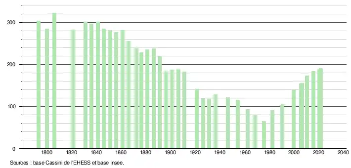 | L'évolution du nombre d'habitants est connue à travers les recensements de la population effectués dans la commune depuis 1793. Pour les communes de moins de 10 000 habitants, une enquête de recensement portant sur toute la population est réalisée tous les cinq ans, les populations légales des années intermédiaires étant quant à elles estimées par interpolation ou extrapolation[40]. Pour la commune, le premier recensement exhaustif entrant dans le cadre du nouveau dispositif a été réalisé en 2005[41]. En 2021, la commune comptait 191 habitants[Note 7], en augmentation de 4,37 % par rapport à 2015 (Ariège : +1,38 %, France hors Mayotte : +1,84 %). |
