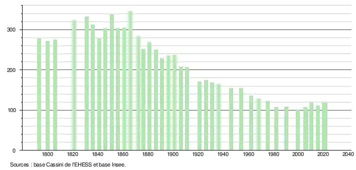 L'évolution du nombre d'habitants est connue à travers les recensements de la population effectués dans la commune depuis 1793. Pour les communes de moins de 10 000 habitants, une enquête de recensement portant sur toute la population est réalisée tous les cinq ans, les populations légales des années intermédiaires étant quant à elles estimées par interpolation ou extrapolation[29]. Pour la commune, le premier recensement exhaustif entrant dans le cadre du nouveau dispositif a été réalisé en 2005[30].