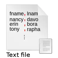 Une vue stylisée d'un fragment de texte provenant d'un fichier au format CSV. Les virgules, en rouge, servent de séparateurs.