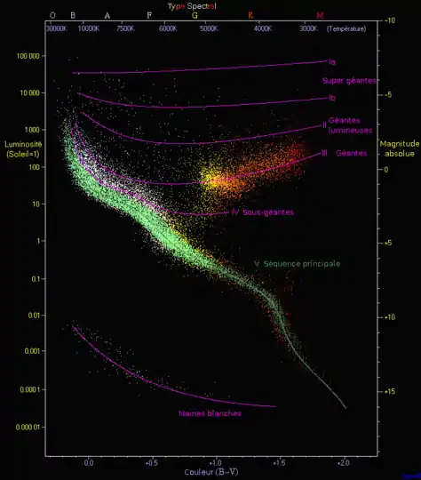 Les valeurs de la luminosité (L), du rayon (R) et de la masse (M) sont relatives à celles du Soleil, une étoile naine de classification spectrale G2 V. Les valeurs réelles pour une étoile peuvent différer de 20 à 30 % des valeurs listées ci-contre[44].