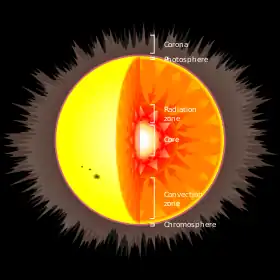 Comme il y a une différence de température entre le cœur et la surface, ou photosphère, l'énergie se propage vers l'extérieur. Les deux modes de transport de l'énergie sont la conduction et la convection. Dans la conduction, l'énergie est principalement transmise par rayonnement à ces températures. Une zone conductive est une zone stable par rapport à la convection, et il y a très peu de mélange de matière. Par contre, dans une zone convective, l'énergie est transportée par le plasma en mouvement : la matière est alternativement chauffée par le cœur et transportée vers l’extérieur, puis refroidie en surface par rayonnement et transportée vers l'intérieur. La convection est un mode plus efficace que la conduction pour le transport de l'énergie, mais elle n'aura lieu que dans des conditions qui créent un fort gradient de température, c'est-à-dire où la température varie rapidement avec la distance au centre[14],[31], par exemple une valeur élevée de l'opacité thermique qui limiterait la conduction. La zone de convection est donc située dans les couches extérieures de l'étoile, dans une zone fortement chauffée a sa base par le cœur et refroidie a sa périphérie par la couche extérieure de l'étoile[32].