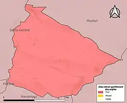 Le retrait-gonflement des sols argileux est susceptible d'engendrer des dommages importants aux bâtiments en cas d’alternance de périodes de sécheresse et de pluie. La totalité de la commune est en aléa moyen ou fort (94,5 % au niveau départemental et 48,5 % au niveau national). Sur les 26 bâtiments dénombrés sur la commune en 2019, 26 sont en aléa moyen ou fort, soit 100 %, à comparer aux 93 % au niveau départemental et 54 % au niveau national. Une cartographie de l'exposition du territoire national au retrait gonflement des sols argileux est disponible sur le site du BRGM[16],[Carte 2].