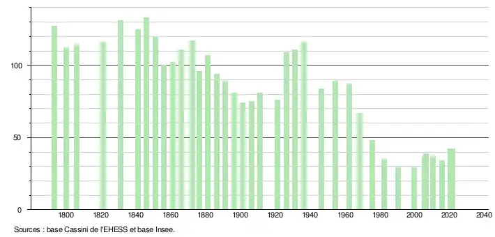 L'évolution du nombre d'habitants est connue à travers les recensements de la population effectués dans la commune depuis 1793. Pour les communes de moins de 10 000 habitants, une enquête de recensement portant sur toute la population est réalisée tous les cinq ans, les populations légales des années intermédiaires étant quant à elles estimées par interpolation ou extrapolation[20]. Pour la commune, le premier recensement exhaustif entrant dans le cadre du nouveau dispositif a été réalisé en 2005[21].